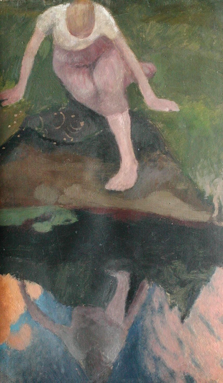 L’autre tableau, en plongée, représente une jeune femme assise au bord de l’eau, une jambe pliée vers l’arrière, son torse penché vers l’avant, contemplant son reflet. La lumière colorée dans le miroir du ciel, Spiegelung (1902), fait penser aux peintres Nabis et au Talisman de Paul Sérusier, peint une dizaine d’années plus tôt. Les couleurs des nuages dorés et roses-violets dans le reflet du ciel qui porte les dernières traces du jour contrastent avec la gamme de couleurs terreuses du rivage. La silhouette, dont on ne voit le visage ni d’en haut, ni d’en bas, est éclairée par l’eau. Dans cette atmosphère onirique et douce, de petites taches claires sur la pierre ou la terre près des jambes reliées par des traits courbes frôlent la dimension décorative d’une peinture symbolique.